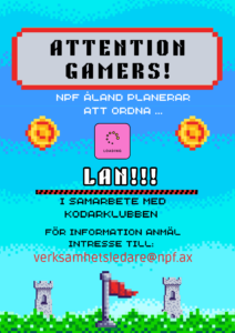 Vill du delta i LAN? NPF Åland planerar att ordna LAN i samarbete med Kodarklubben. Är du intresserad av att delta? För mer information skriv till: verksamhetsledare @npf.ax